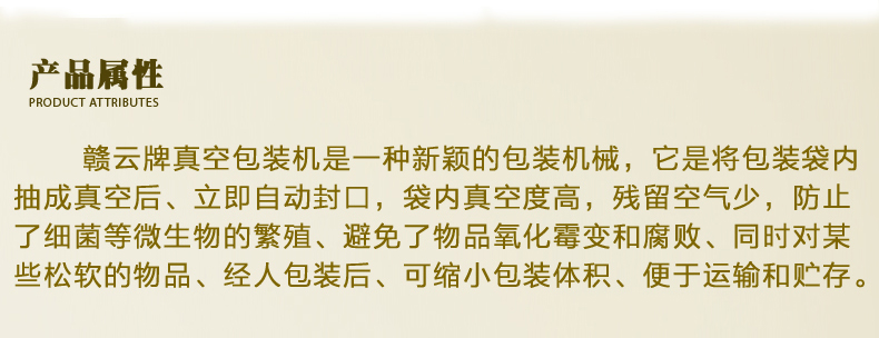 贛云牌真空包裝機是一種新穎的包裝機械,它是將包裝袋內(nèi)抽成真空后、立即自動封口,袋內(nèi)真空度高,殘留空氣少,防止了細(xì)菌等微生物的繁殖、避免了物品氧化霉變和腐敗、同時對某些松軟的物品、經(jīng)人包裝后、可縮小包裝體積、便于運輸和貯存。
