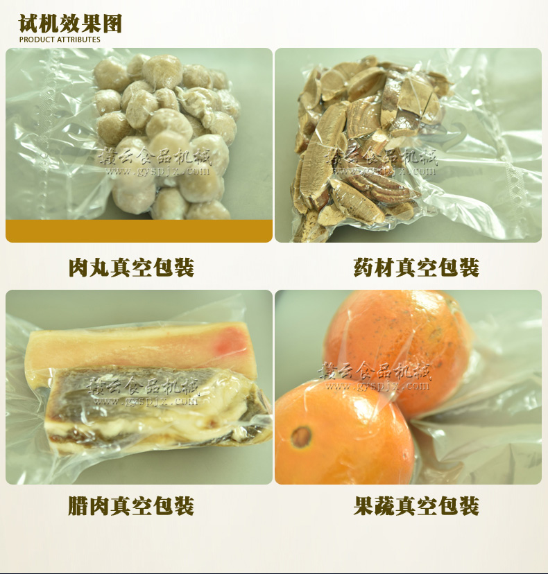 2、將所需包裝的物品裝入包裝袋【塑料復(fù)合袋或鋁箔復(fù)合袋】內(nèi),放入真空室內(nèi),提起壓條,均勻的把袋口置于熱封架上排好,然后放下壓條。