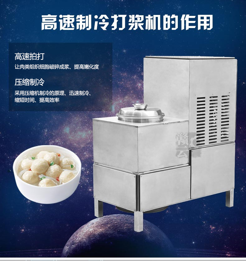 本設(shè)備采用304不銹鋼材質(zhì)加工設(shè)計(jì),在原高速/慢速打漿機(jī)的基礎(chǔ)上,將3P制冷壓縮機(jī)嵌入打漿機(jī)內(nèi),解決了高速/慢速肉丸打漿過程中因拍打破碎等工序引起升溫改變?nèi)赓|(zhì)難題,制冷效果顯著,產(chǎn)品一經(jīng)推出,倍受肉制品加工商企客戶青睞。