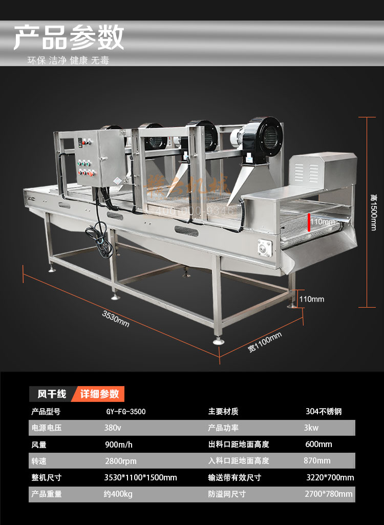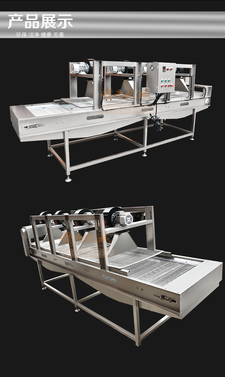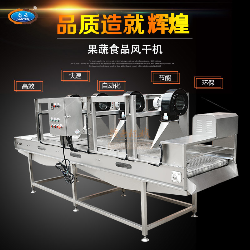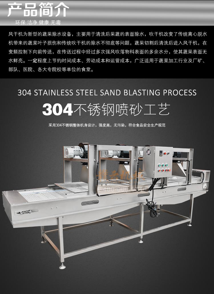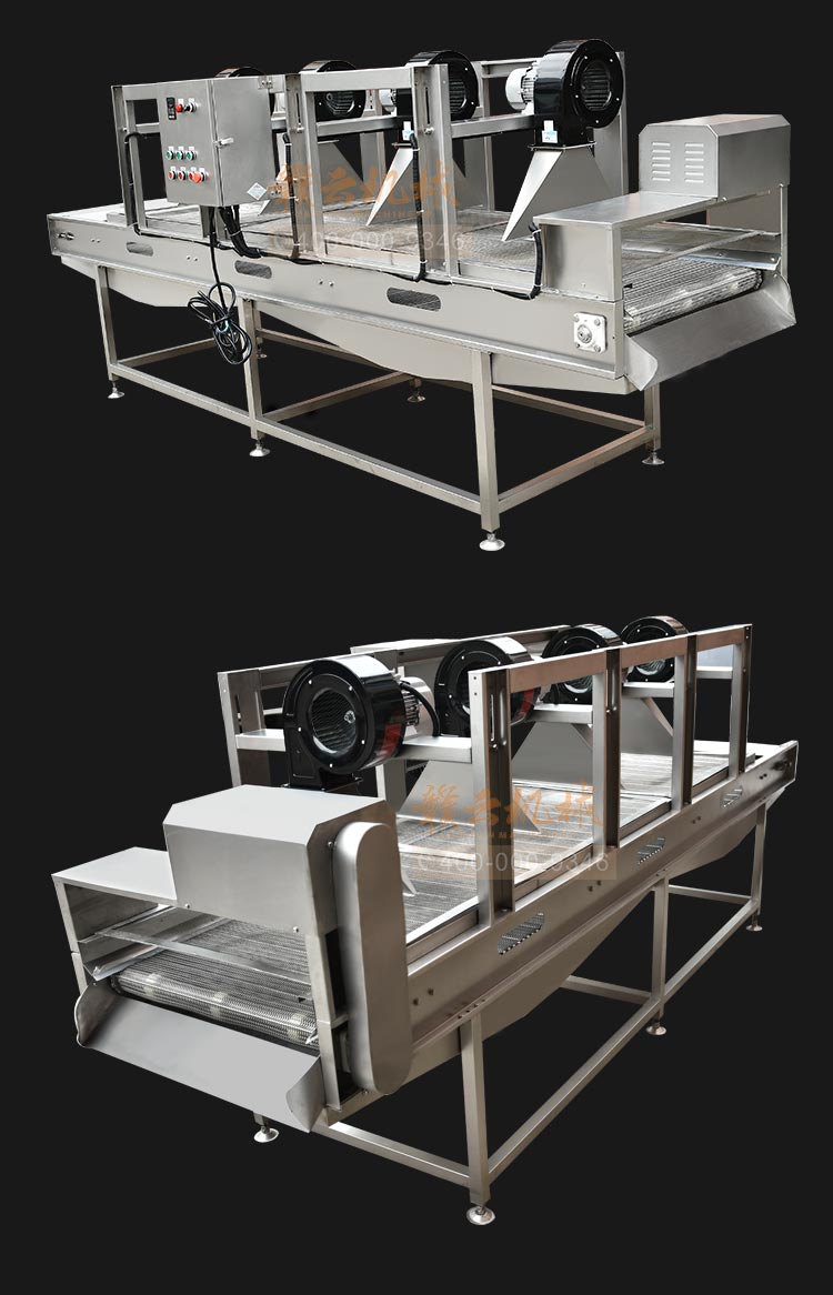 果蔬食品風干機,高效、快速、環(huán)保、安全、自動化。強風去除表面水分+震動輸送。果蔬食品風干機主要用于清洗后的果蔬去除表面水,震動吹干改變了傳統(tǒng)離心脫水機帶來的蔬菜也損傷和傳統(tǒng)風干機除水不徹底等問題,蔬果切割后清洗后進入震動風干機,在震動頻率下使物料向前傳送,在傳送過程中經(jīng)過多次強風吹落物料表面的多余水分,使其蔬果表面無水鮮亮。最大程度上節(jié)約時間成本,勞動成本和運營成本,廣泛適用于蔬菜加工行業(yè)及廠礦、部隊、醫(yī)院、各大院校等單位食堂。