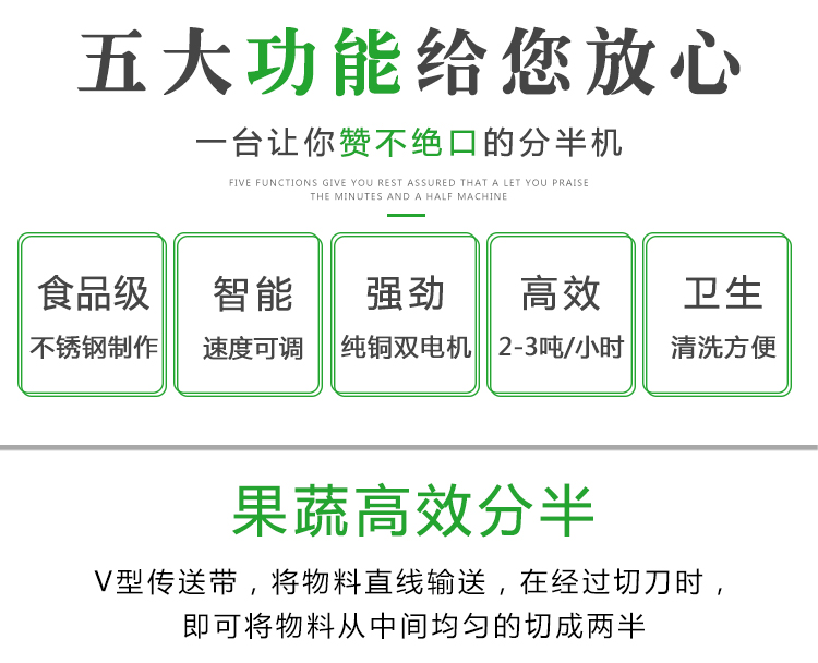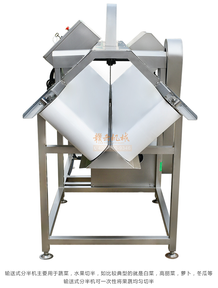 切半機(jī)主要用于果蔬類(lèi)蔬菜加工。可將圓形,橢圓性,長(zhǎng)條形,等物料,切割成兩半。該設(shè)備常用于以下一些場(chǎng)所,泡菜加工,果蔬類(lèi)加工廠(chǎng),政府機(jī)關(guān)單位,無(wú)刀化廚房等。該設(shè)備物料切割勻稱(chēng),分半大小一致,大顆的白菜蘿卜冬瓜都可一次性分割成兩半。是果蔬加工行業(yè)的好幫手