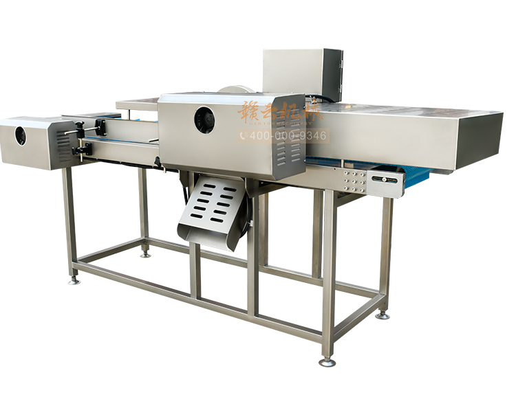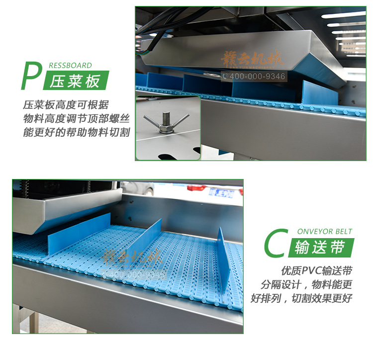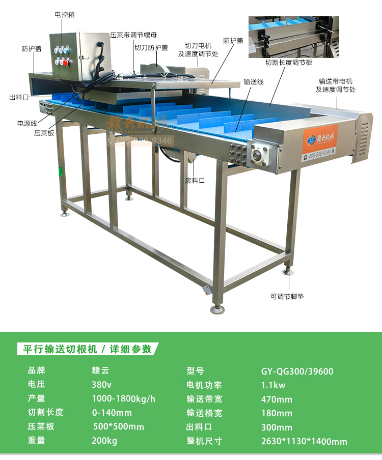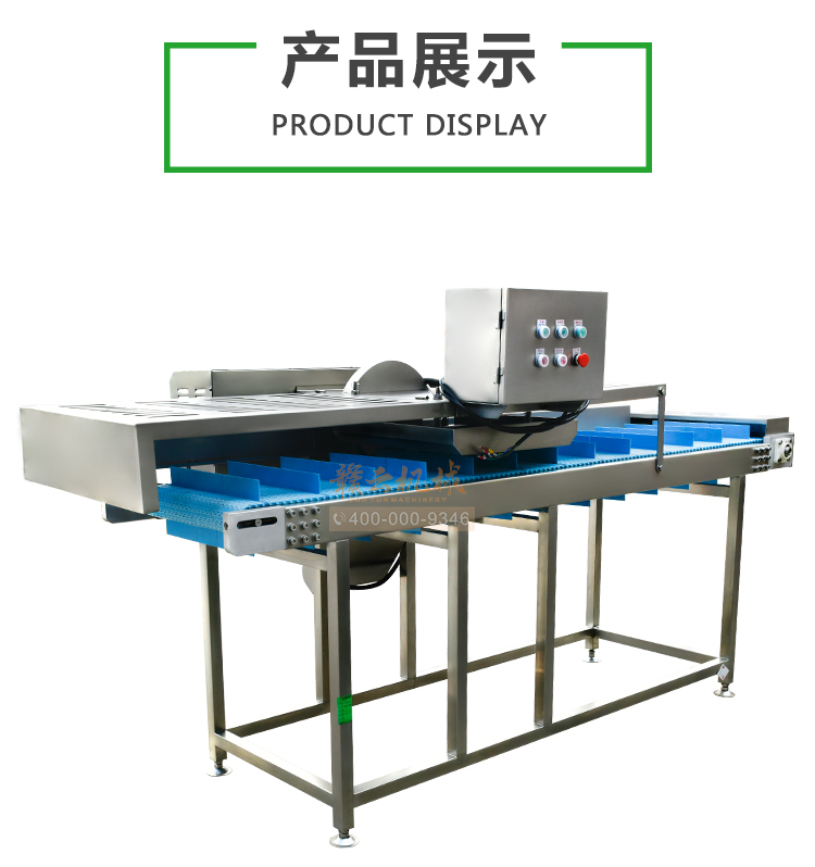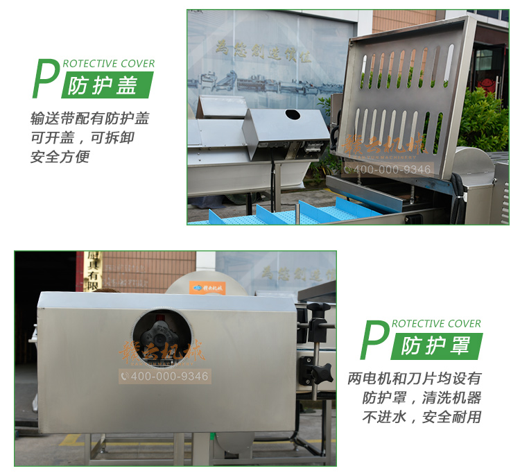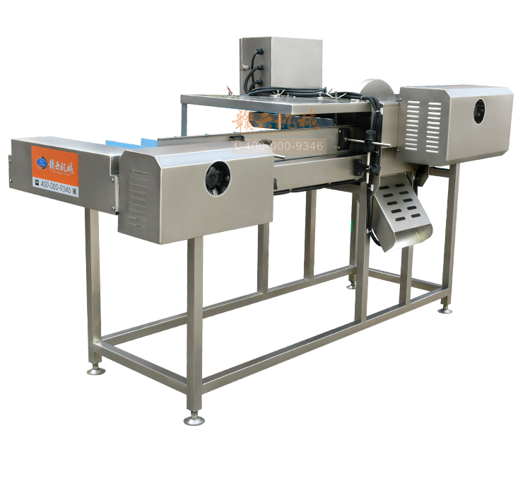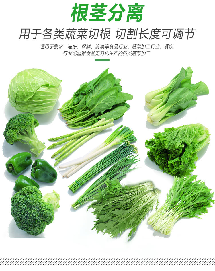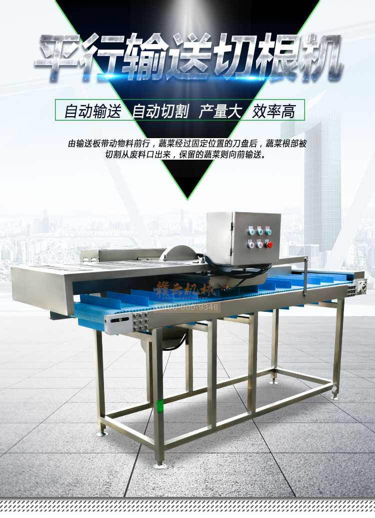 平行輸送去根機(jī)由輸送板帶動(dòng)物料前行,蔬菜經(jīng)過(guò)固定位置的刀盤(pán)后,蔬菜根部被切割從廢料口出來(lái),保留的蔬菜則向前輸送。切割的長(zhǎng)度可以調(diào)節(jié),每顆蔬菜所切割出來(lái)的廢料都相等。去根機(jī)適合大型食品加工廠、凈菜生產(chǎn)線等。