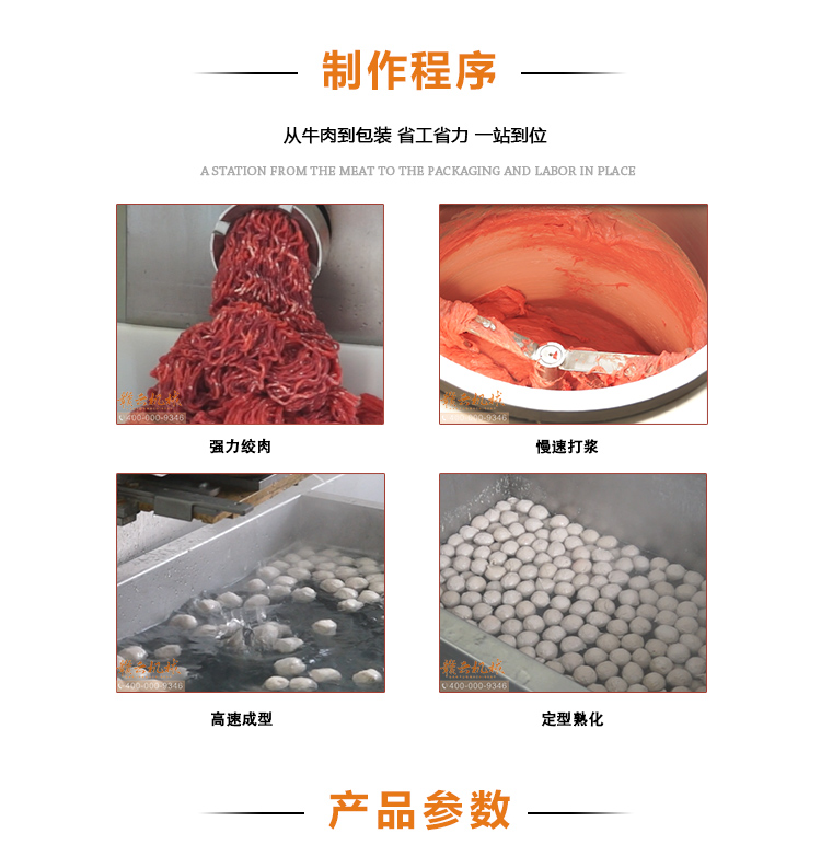 本套設(shè)備由:52型強(qiáng)力絞肉機(jī)、三速制冷打漿機(jī)、單刀高速肉丸成型機(jī)和1500型智能溫控雙加熱水槽設(shè)備組合而成、專業(yè)生產(chǎn)牛肉貢丸,豬肉丸,日產(chǎn)貢丸可達(dá)三噸。