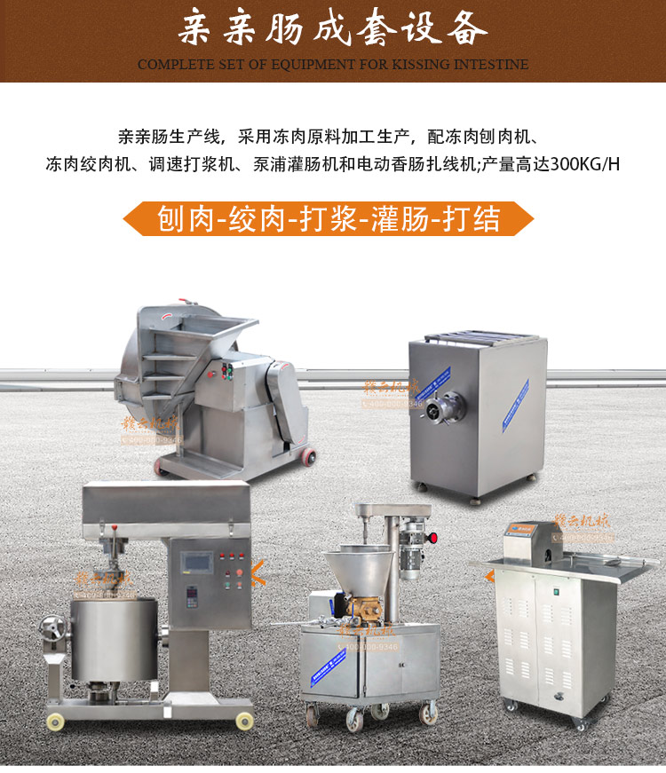 親親腸生產(chǎn)線,采用凍肉原料加工生產(chǎn),配凍肉刨肉機、凍肉絞肉機、調(diào)速打漿機、泵浦灌腸機和電動香腸扎線機。