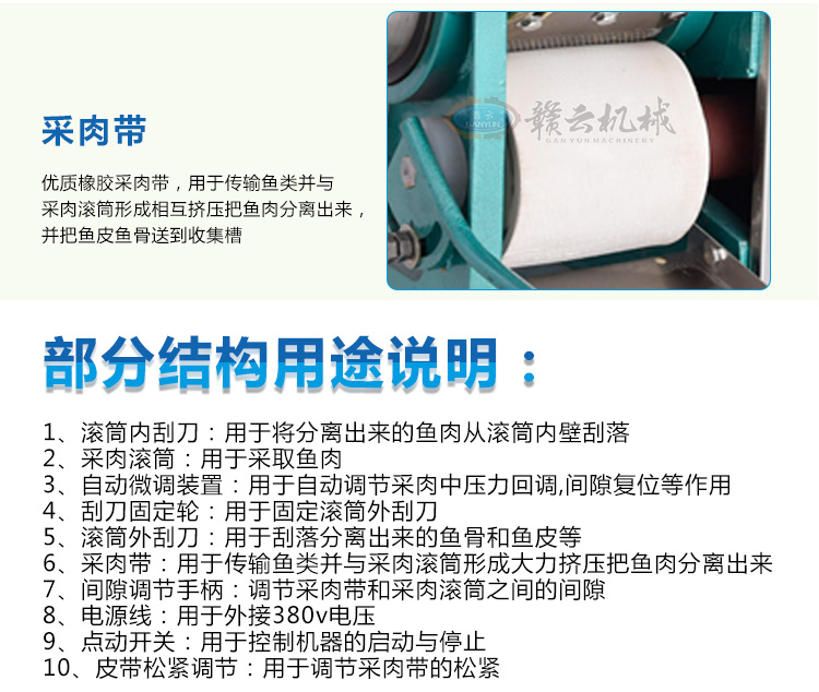 贛云牌新品普通款魚肉采肉機160型帶輪子,便于移動,魚肉魚刺分離原理:切好的魚小塊(整蝦、小蟹、小魚等)通過采肉帶輸送至采肉滾筒與采肉帶間隙,兩則相對滾動產(chǎn)生大力擠壓將魚肉擠入采肉滾筒內(nèi),魚刺和魚皮、魚鱗等因采肉滾筒壁小孔直徑只有3.5mm而無法進入,被滾筒外刮刀刮落,完成魚肉與魚骨、魚皮、魚鱗的分離。
