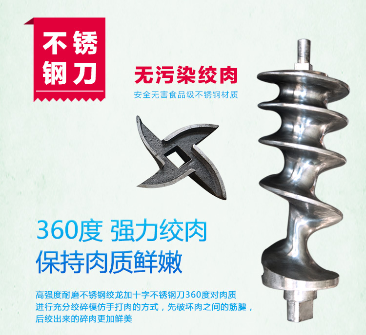 這款32B型強(qiáng)力絞肉機(jī)采用不銹鋼材質(zhì)加工精致而成,改傳統(tǒng)的鑄鐵絞肉機(jī)頭為不銹鋼絞肉機(jī)頭,使之接觸食品部位均為不銹鋼材質(zhì),不生銹,達(dá)到食品安全衛(wèi)生要求。