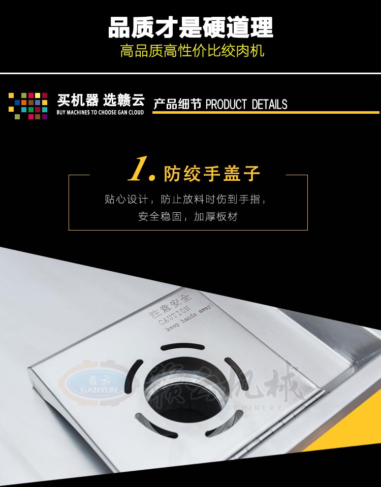 高質(zhì)量高性價比絞肉機 防絞手蓋子 貼心設計 防止絞肉時傷到手指 放料托盤 包邊設計 安全放心 防水開關人性化設計 人體工程學把手 方便搬運 配有萬向輪 裝配有純銅電機