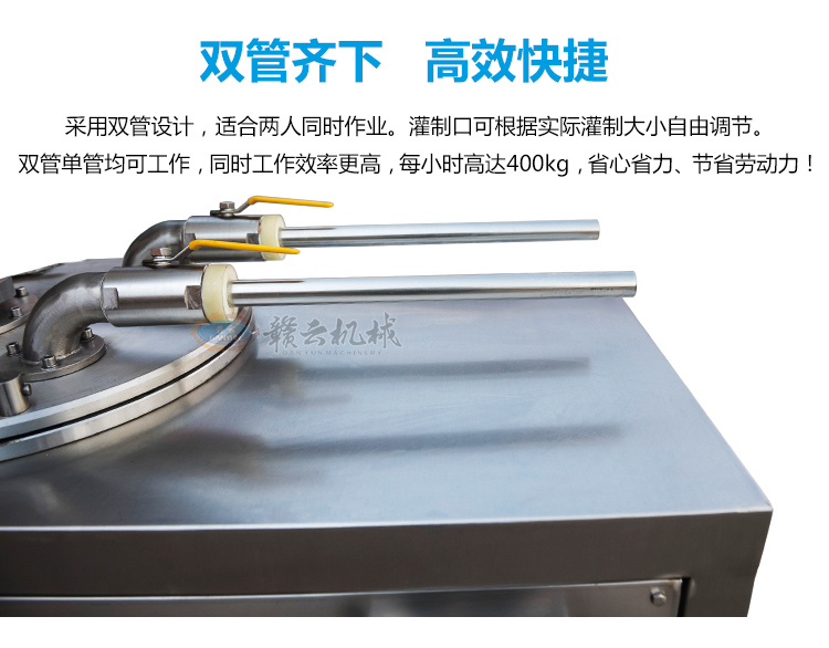 贛云液壓灌腸機,新款灌漿機,雙管灌腸機采用液壓灌漿推料原理設計,密封性能良好,配合雙管灌漿,可自動調節(jié)灌漿,自動吸料,腳踏開關控制操縱自如。是腸類灌腸設備。
