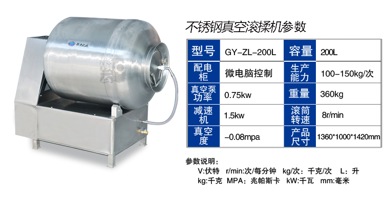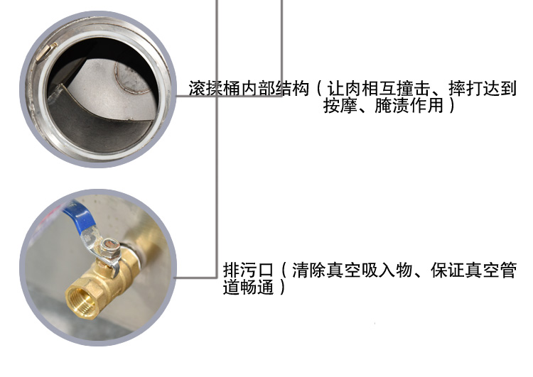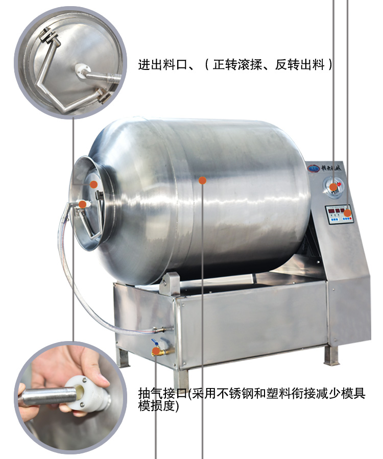 真空滾揉機(jī)可以使肉均勻的吸收腌漬,可以提高肉的結(jié)著力及產(chǎn)品的彈性;可以提高產(chǎn)品的口感及斷面效果;可以增強保水性,增加出品率;可以改善產(chǎn)品的內(nèi)部結(jié)構(gòu),節(jié)能高效。整機(jī)采用不銹鋼制造,結(jié)構(gòu)緊湊,滾筒兩端均采用旋壓式封帽結(jié)構(gòu),大大的增加滾筒內(nèi)的摔打空間,使?jié)L揉產(chǎn)品的效果均勻,噪音小,性能可靠,操作簡便,使用效率更高。