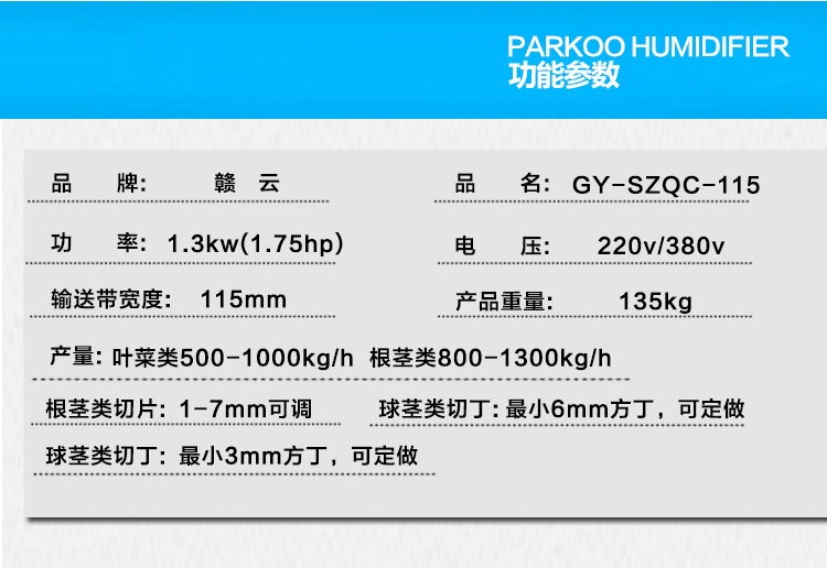 用途:將根莖類蔬菜:馬鈴薯、蕃薯、瓜類、竹筍、洋蔥、茄子以及葉菜類蔬菜:芹菜、大白菜、高麗菜、菠菜等蔬果類切成丁、片、絲條、段、粒狀。