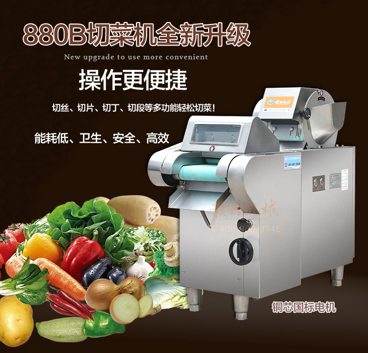 贛云880B型切菜機,采用標(biāo)準(zhǔn)不銹鋼板材加工設(shè)計,做工精細,外形美觀大方,利用齒輪偏心設(shè)計手動旋鈕便攜可調(diào)走刀量,在原880A型切菜機基礎(chǔ)上改良設(shè)計而成,解決多功能切菜機手動走刀量調(diào)節(jié)問題,是食堂,企業(yè)單位、酒店廚房多樣切菜設(shè)備。