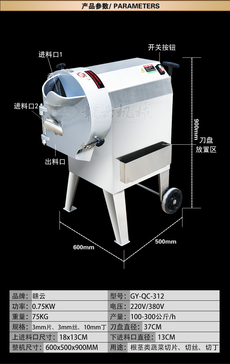 贛云312型多功能切菜器看起來體積不是特別大,整臺(tái)機(jī)器設(shè)計(jì)理念就是以輕巧輕便為方向,讓機(jī)器本身在廚房中不會(huì)占有用多大的空間,雖然看起來個(gè)頭不大,但機(jī)器生產(chǎn)量可不小,可達(dá)到每小時(shí)300公斤的產(chǎn)量,而且易于清洗,在通過以往的長(zhǎng)時(shí)間數(shù)據(jù)顯示,機(jī)器本身也有著很長(zhǎng)使用壽命和低故障,在機(jī)器使用過程中只要我們按照正確的使用方法,就不會(huì)容易出現(xiàn)故障等問題,即使機(jī)器長(zhǎng)時(shí)間不使用也可以將機(jī)器清洗干凈晾干后放置在干燥通風(fēng)的地方保存好以免受潮損壞。