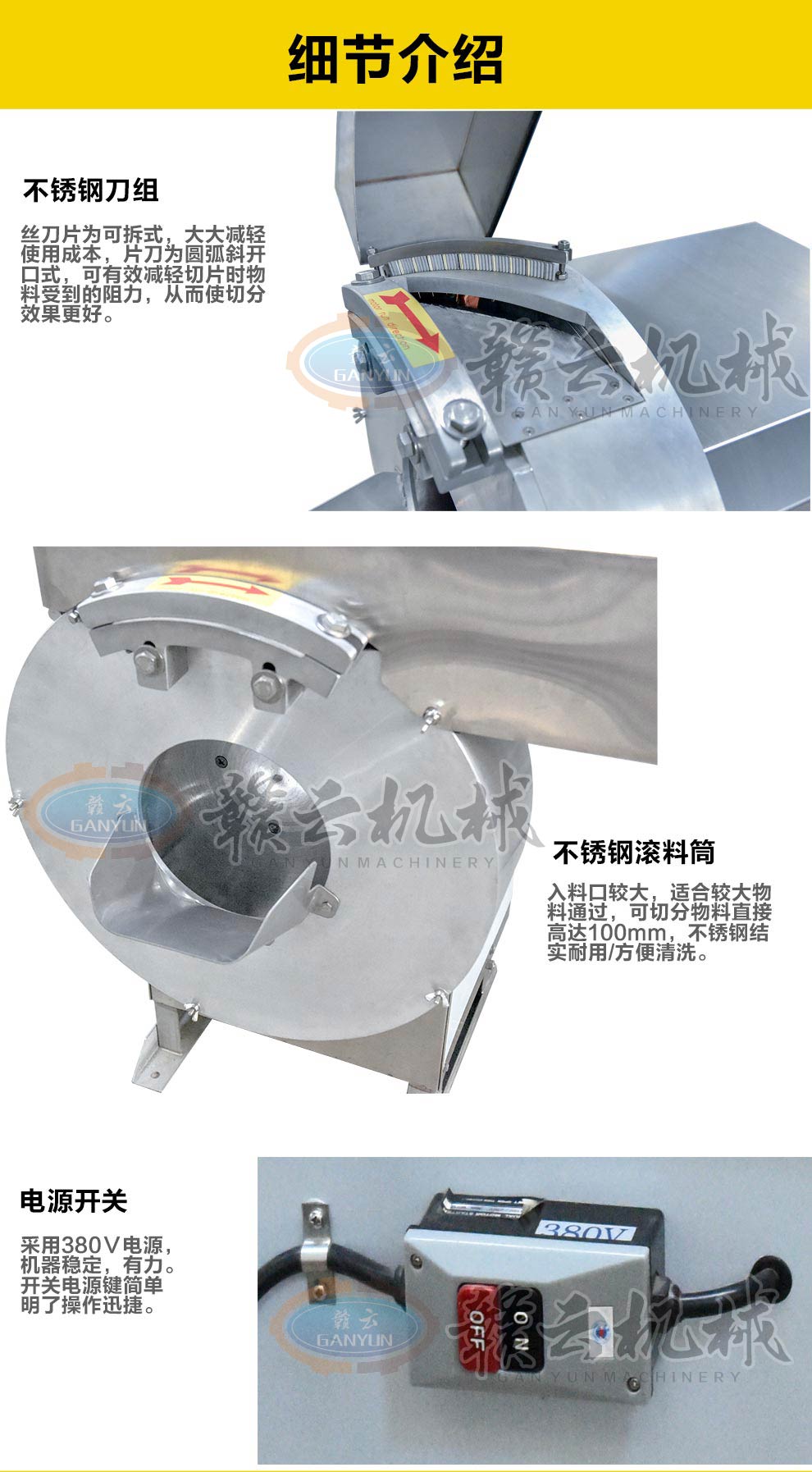產(chǎn)品簡介:GY-ST-502切薯?xiàng)l薯片機(jī)主要用于將塊莖類的果蔬切成片狀或是條狀,刀片采用優(yōu)質(zhì)不銹鋼材料制造,鋒利無比,使切削出來的薯?xiàng)l薯片表面光滑。本機(jī)操作簡單,效率高,便于清潔。機(jī)器外部全部采用不銹鋼與鋁合金制造,所有與食物接觸的零部件均采用不銹鋼和鋁合金材料制作,主要用于薯?xiàng)l加工、酒店、餐飲店和相關(guān)的食品加工行業(yè)。
