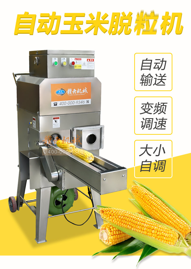 設(shè)計(jì)合理——整機(jī)采用全不銹鋼制造,配合腳輪移動(dòng)方便;變頻器控速、操作簡(jiǎn)單;適合各種鮮、甜、糯玉米、凍玉米解凍后脫粒;