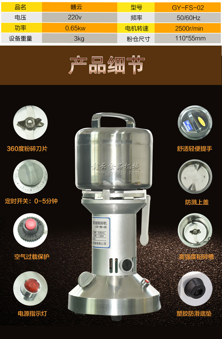 贛云系列多功能粉碎機采用純銅高速電機帶動粉碎刀片將物料快速打成粉末,可用于粉碎五谷、雜糧、田七、阿膠、白叁等,一般粉碎時間1-2分鐘即可,新款粉碎機改保險絲為空氣過載保護器,使用更安全,我廠提供的粉碎機有100克-1000克不同型號的多功能粉碎機。