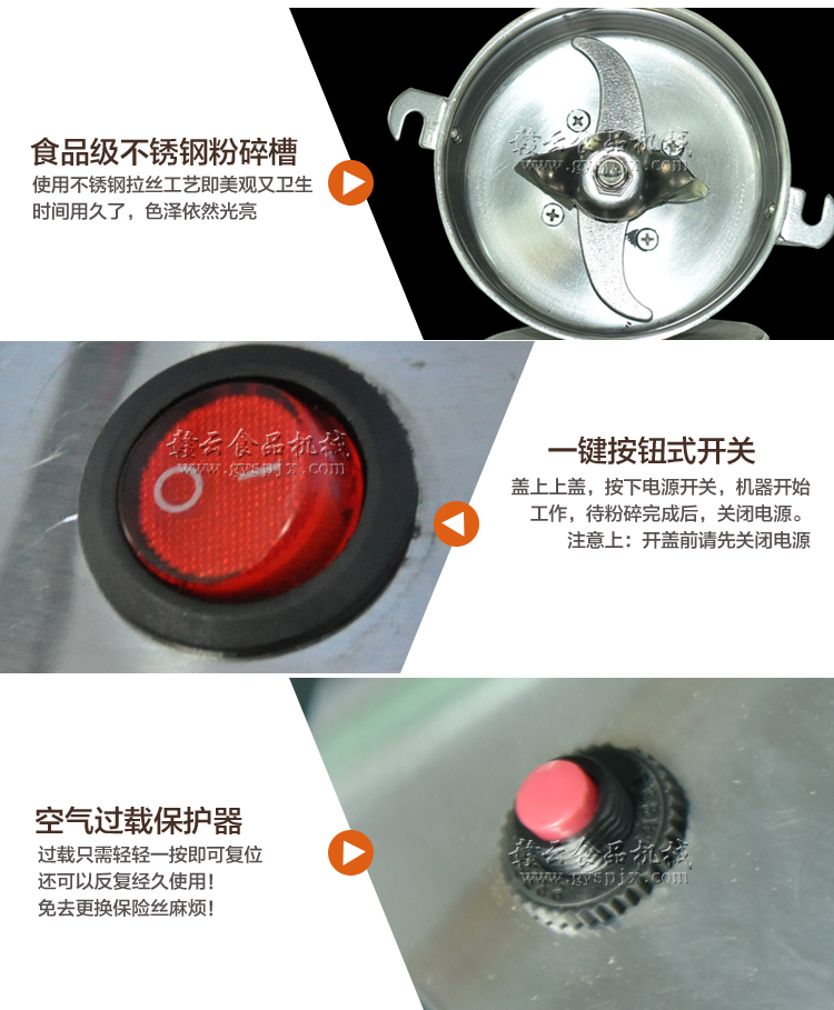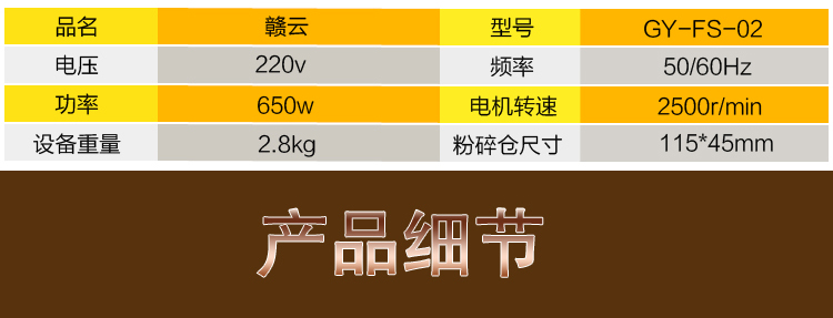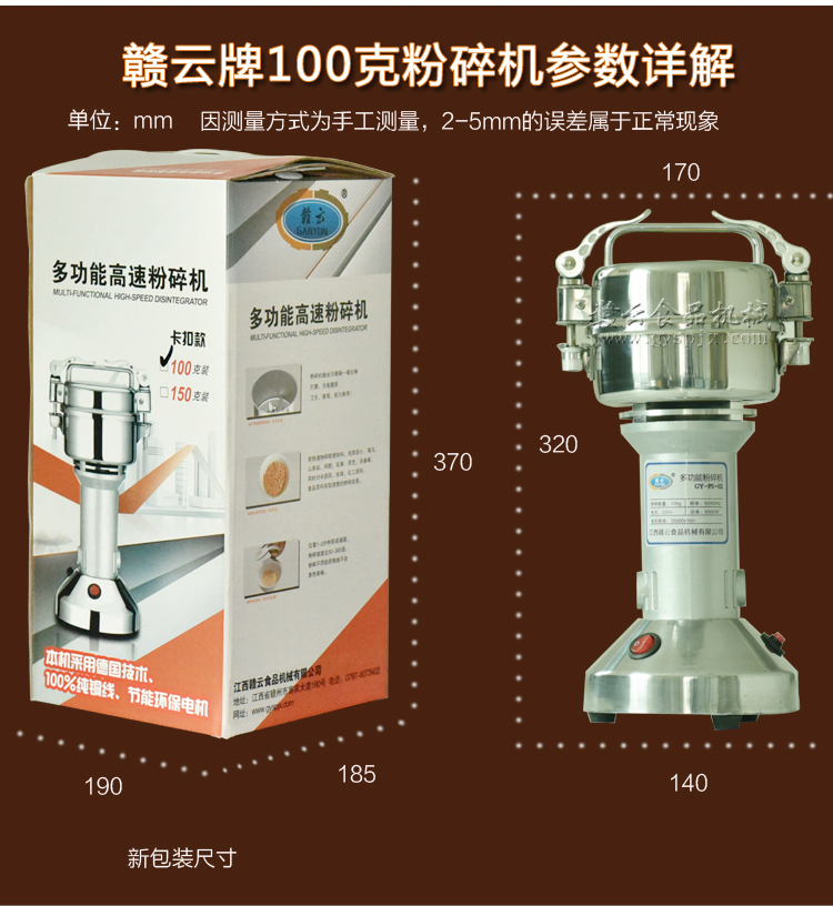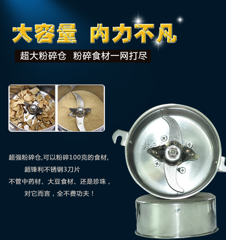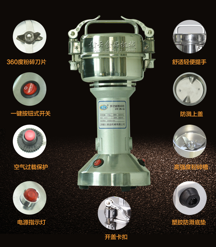 贛云系列多功能粉碎機采用純銅高速電機帶動粉碎刀片將物料快速打成粉末,可用于粉碎五谷、雜糧、田七、阿膠、白叁等,一般粉碎時間1-2分鐘即可,新款粉碎機改保險絲為空氣過載保護器,使用更安全,我廠提供的粉碎機有100克-1000克不同型號的多功能粉碎機。