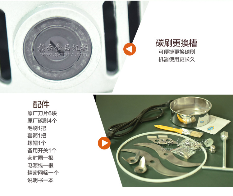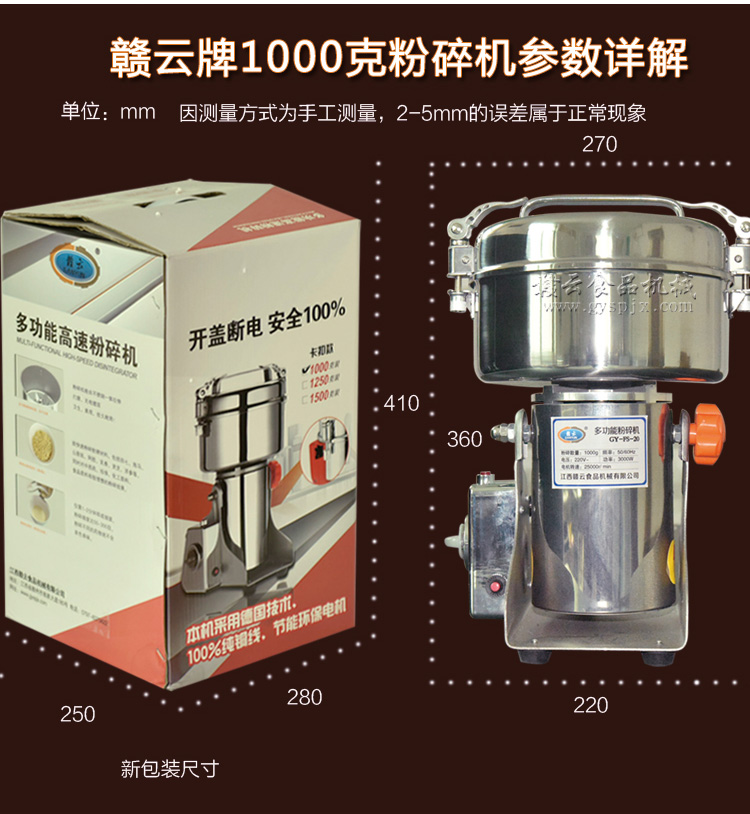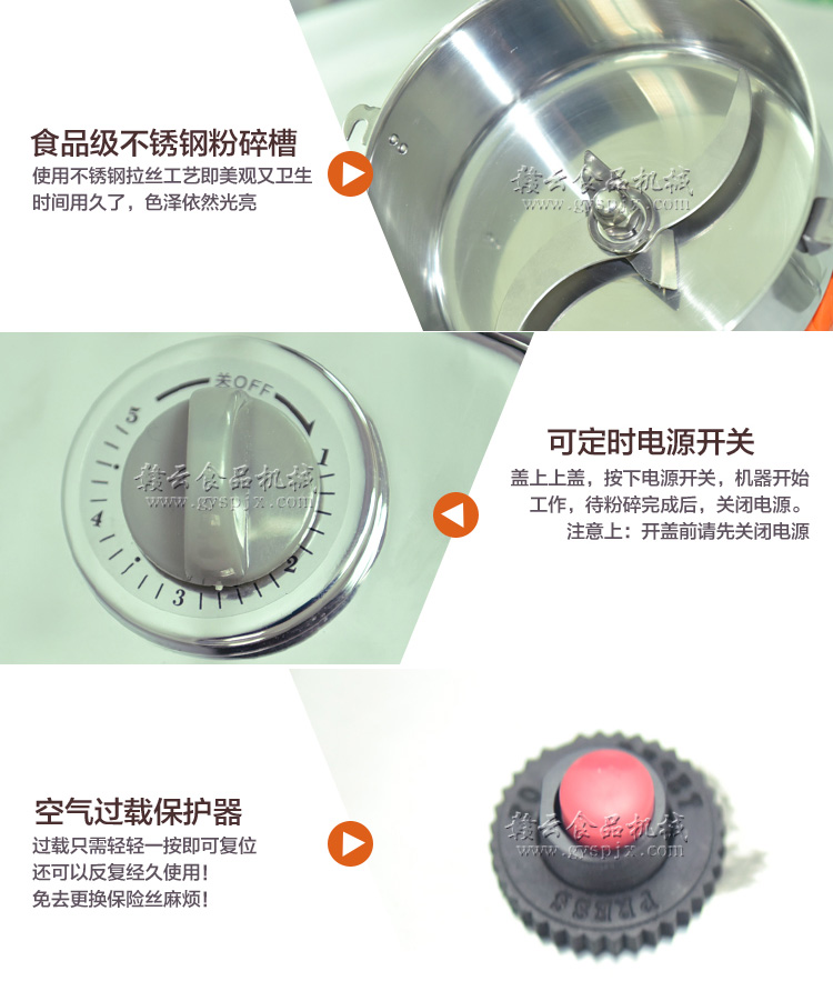 贛云系列多功能粉碎機采用純銅高速電機帶動粉碎刀片將物料快速打成粉末,可用于粉碎五谷、雜糧、田七、阿膠、白叁等,一般粉碎時間1-2分鐘即可,新款粉碎機改保險絲為空氣過載保護(hù)器,使用更安全,我廠提供的粉碎機有100克-2500克不同型號的多功能粉碎機。