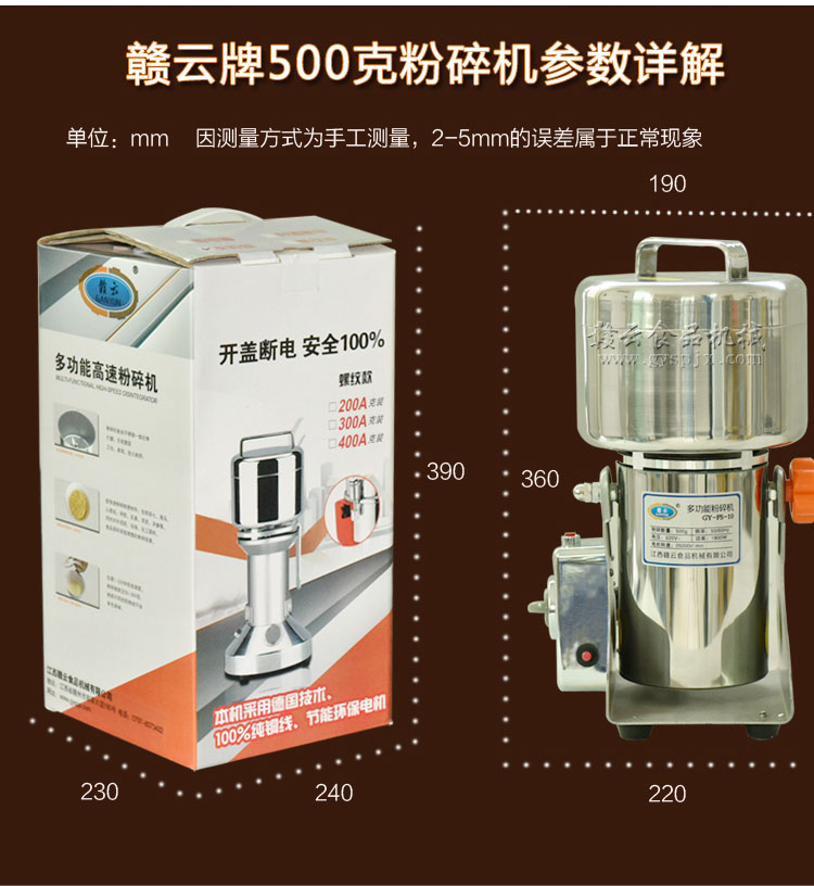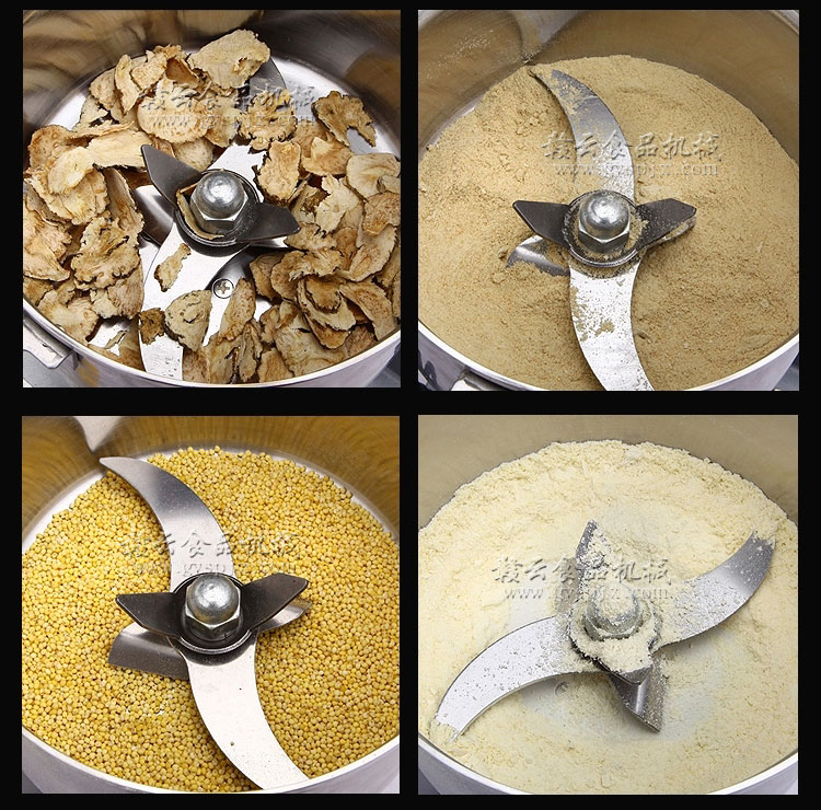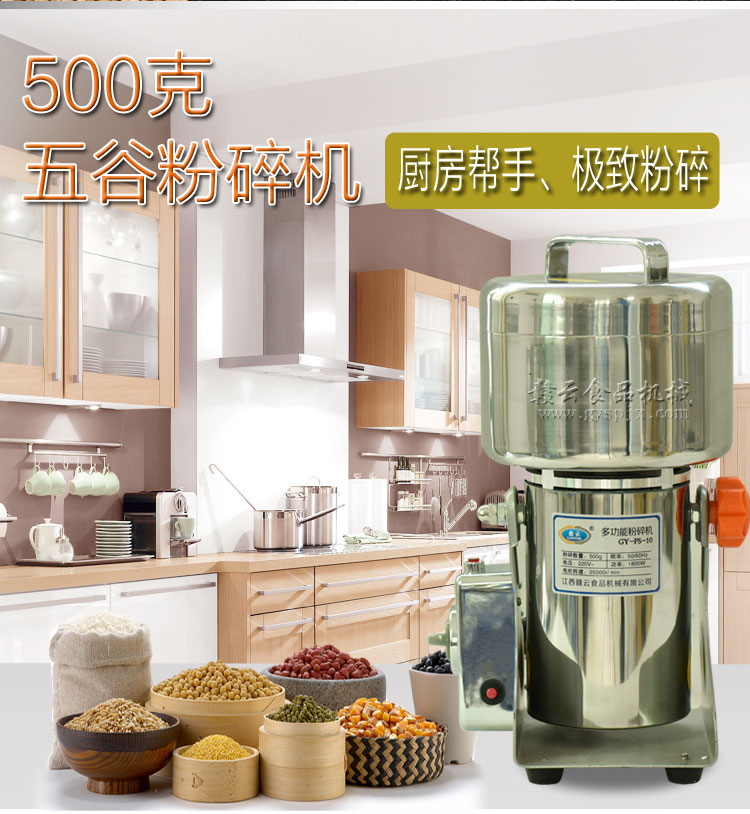 贛云系列多功能粉碎機采用純銅高速電機帶動粉碎刀片將物料快速打成粉末,可用于粉碎五谷、雜糧、田七、阿膠、白叁等,一般粉碎時間1-2分鐘即可,新款粉碎機改保險絲為空氣過載保護器,使用更安全,我廠提供的粉碎機有100克-1000克不同型號的多功能粉碎機。
