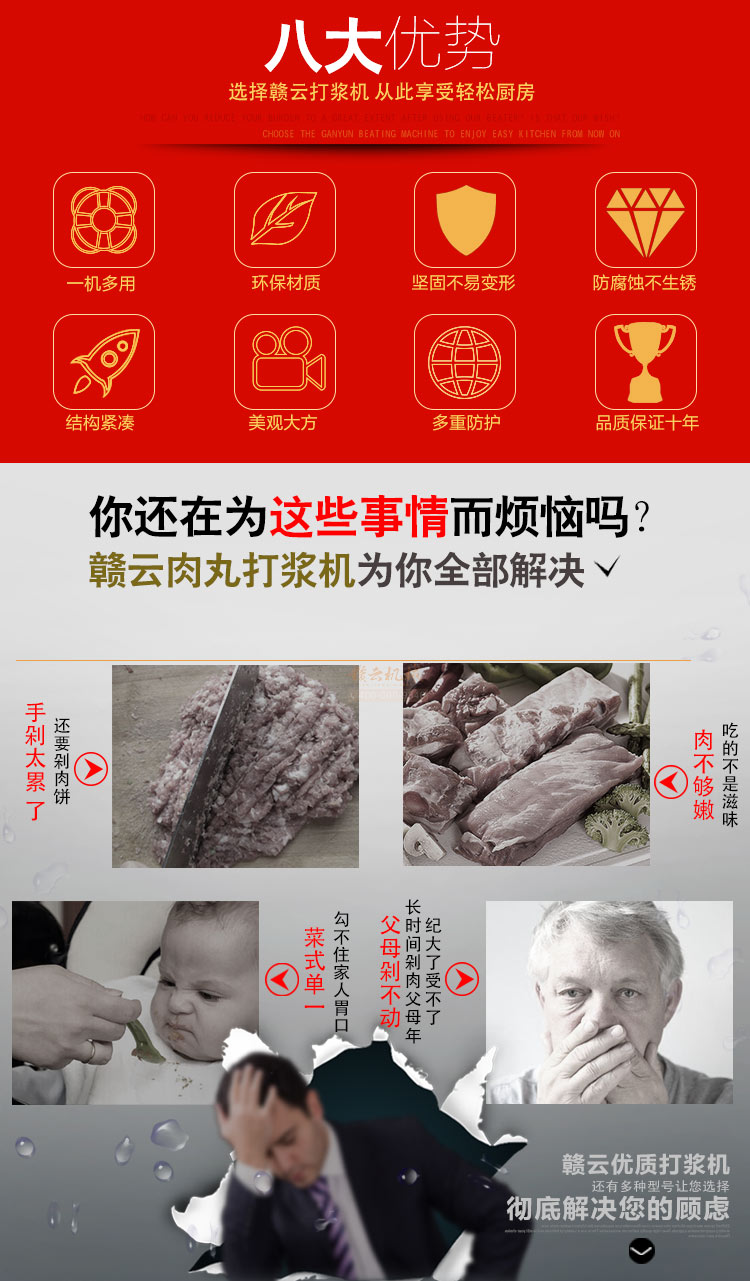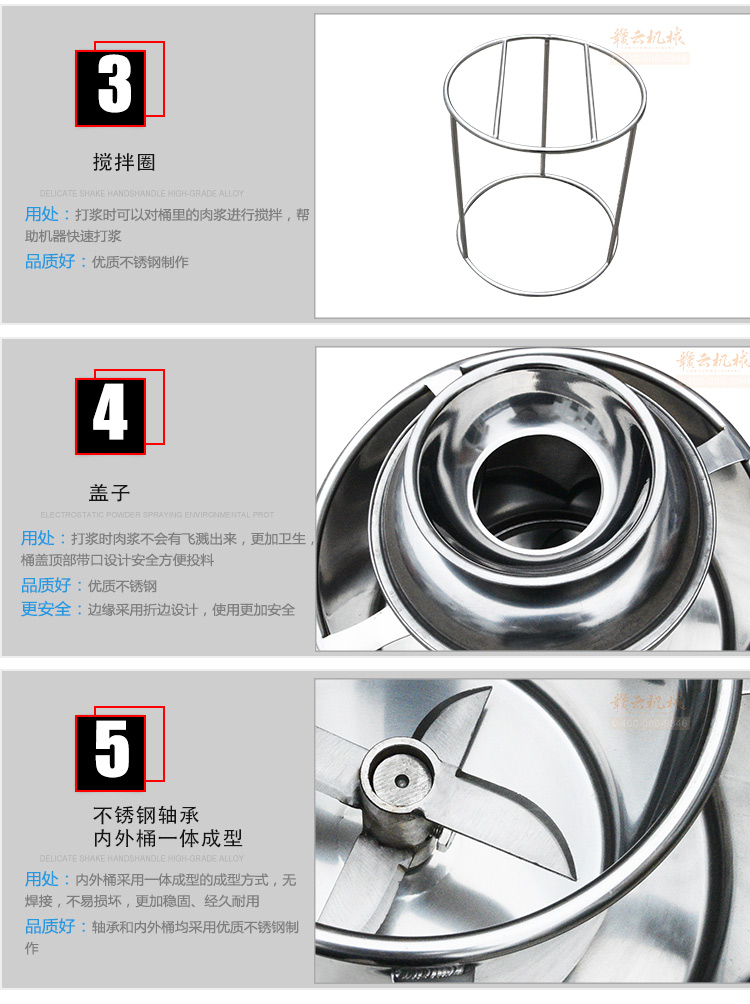 贛云牌新款全不銹鋼肉丸機(jī),18型肉丸機(jī)采用全不銹鋼材質(zhì),在舊款全不銹鋼肉丸機(jī)的基礎(chǔ)上給支撐架加粗加厚,用不銹鋼蓋,打漿雙桶,刀柄刀片均采用不銹鋼材質(zhì)。打漿桶裝肉量1L,一次可打肉漿1-2斤左右,采用2800r/min高速電機(jī),故稱之為高速肉丸機(jī)。