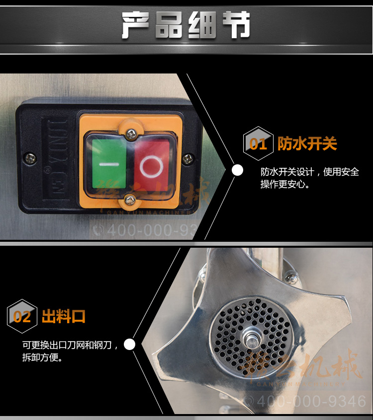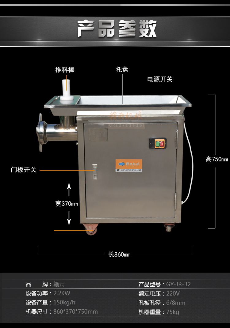 贛云牌32型不銹鋼立式絞肉機(jī),防水開關(guān),二級(jí)減速,齒輪鏈條傳動(dòng),接觸食品部位全部不銹鋼材質(zhì),配6mm、8mm刀網(wǎng),兩個(gè)十字刀,并配實(shí)心推料棒!絞肉就是不一樣。