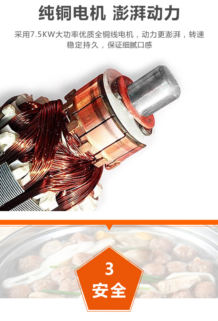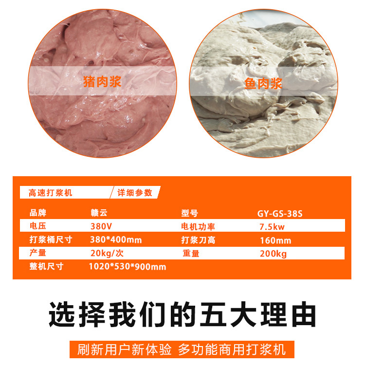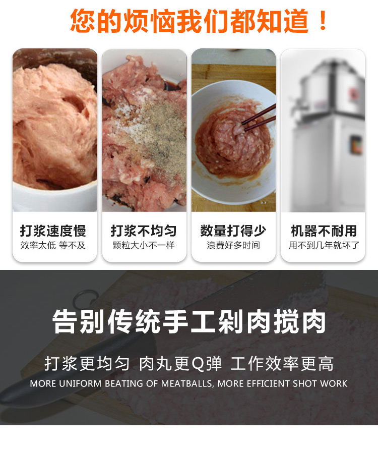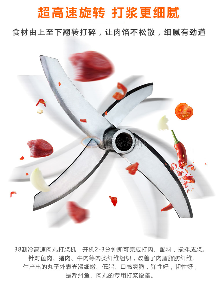 多功能肉丸打漿機擁有高速旋轉(zhuǎn),達到快速碎食效果,讓打漿更細膩,讓您告別傳統(tǒng)手工剁肉攪肉打漿,將食材放入打漿機器入料口,食材由上至下翻轉(zhuǎn)打碎,讓肉餡不松散,細膩有勁道,此款38制冷高速肉丸打漿機,開機2-3分鐘即可完成打肉、配料、攪拌成漿。針對魚肉、豬肉、牛肉、等肉類纖維組織、改善了肉質(zhì)脂肪纖維,生產(chǎn)出來的丸子外表光滑細嫩、低脂、口感爽脆,彈性好,韌性好,是潮州魚、肉丸的打漿設(shè)備。