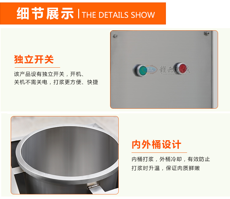 高速打漿機選用全不銹鋼制作,開機2-3分鐘即可完成打肉、配料,攪拌成漿。針對魚肉豬肉的纖維組織,高速生產(chǎn)過程中改善了肉質(zhì)脂肪纖維,生產(chǎn)出的丸子外表光滑細嫩、低脂、口感爽脆,彈性好,韌性好,是潮州魚、肉丸的專用打漿設(shè)備。此款肉丸高速打漿機還可以連續(xù)投料打漿,效率高,打漿效果好,根據(jù)肉丸生產(chǎn)產(chǎn)量需求可定做,因此深受肉丸加工廠家青睞設(shè)備!