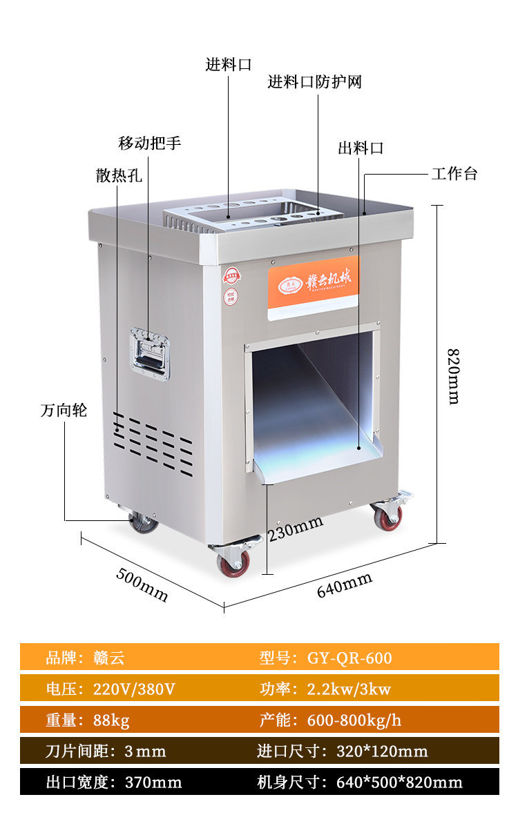 贛云工程款切肉機(jī),可以切各種肉類,切片、切絲、切末一機(jī)搞定,也可以切軟蔬菜,例如:榨菜、魔芋、香菇、辣椒等,贛云新款切肉機(jī)配置新升級,使用優(yōu)質(zhì)大功率電機(jī),采用不銹鋼機(jī)身,機(jī)器機(jī)身清洗方便,增加安全防護(hù),加大了入料口,增加工作效率,新款商用切肉機(jī)一機(jī)多能,可以滿足多樣需求。