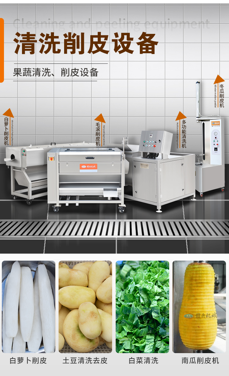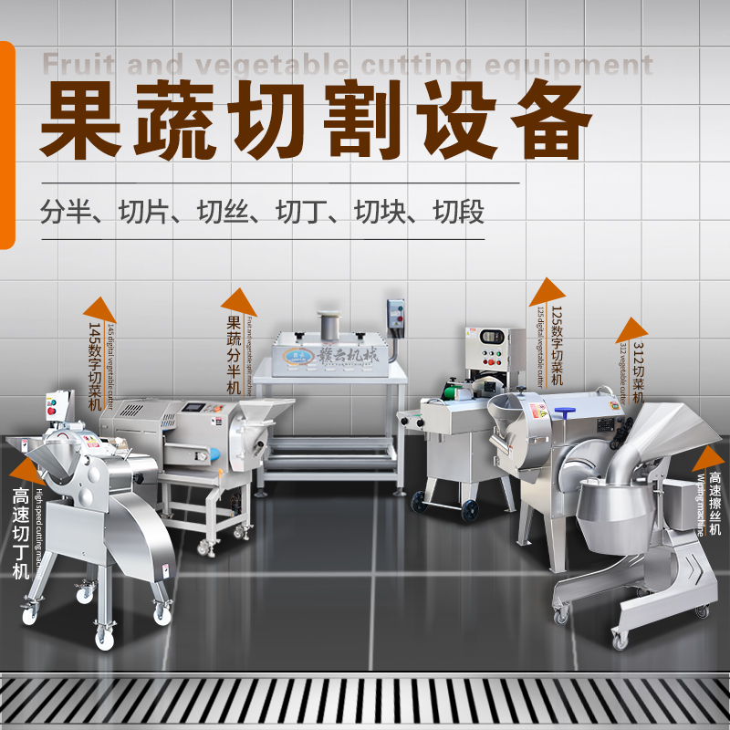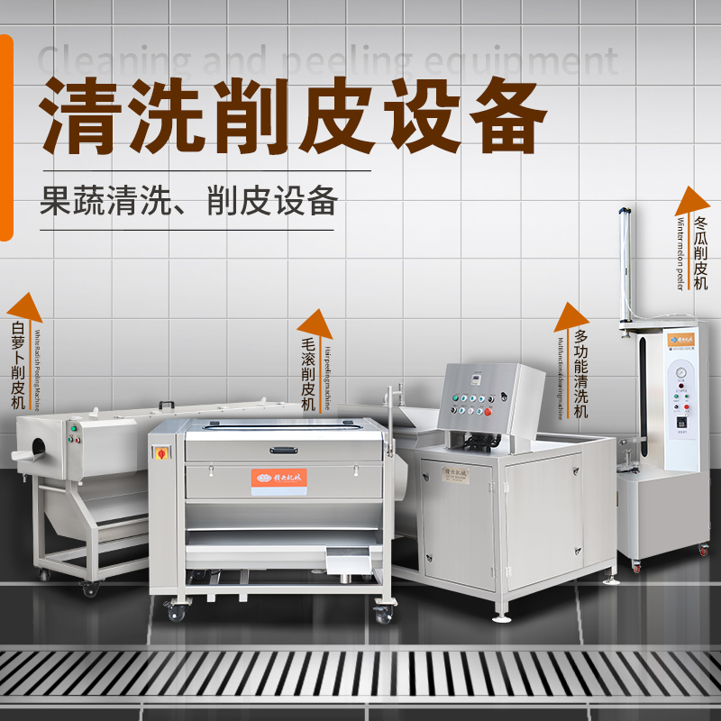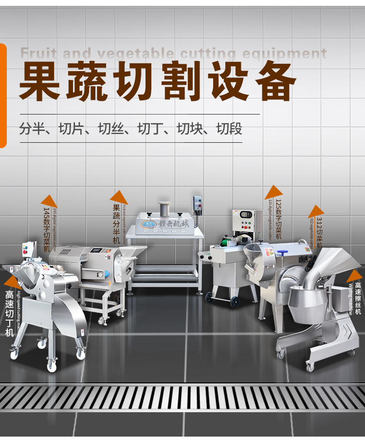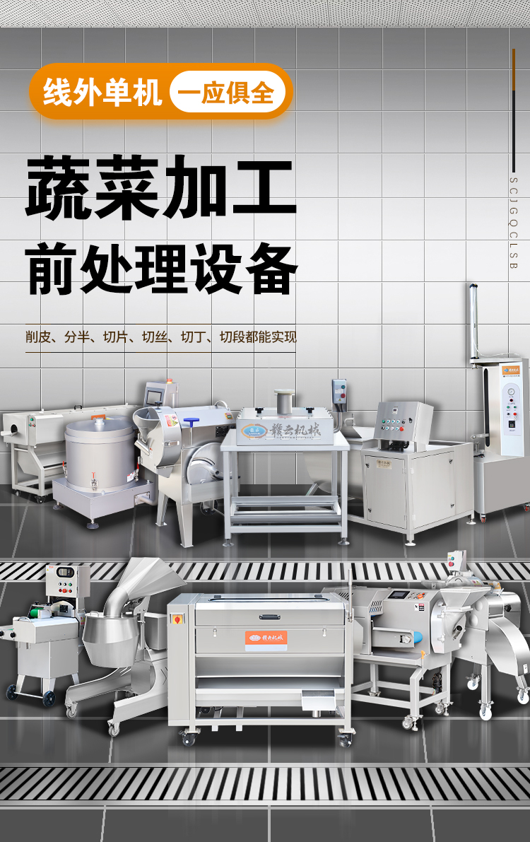 用于果蔬清洗、去皮、切菜、切片、切絲、切丁、切段、切碎、切沫、脫水等加工設備。