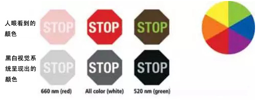 通過黑白單色相機(jī)也可以識別圖像中的顏色,這種方法需要選擇合適的燈光照明圖像。圖中上面一行圖片是人眼觀察到的圖像效果,而下面一行的圖像則顯示了單色相機(jī)呈現(xiàn)出的圖像效果。