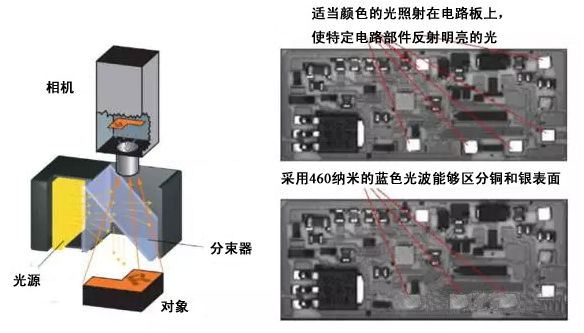 適當(dāng)顏色的光源照射在電路板上,能使特定的電路板部件反射明亮的光,而錯誤安裝的部件會吸收光而呈現(xiàn)出暗色。機(jī)器視覺系統(tǒng)能夠迅速識別這些錯誤。在這種應(yīng)用中,采用同軸照明技術(shù)及藍(lán)色光源。藍(lán)色波長(460納米)能明顯區(qū)分銀和銅表面:銅吸收藍(lán)光,出現(xiàn)暗色,銀反射藍(lán)光,出現(xiàn)亮色。