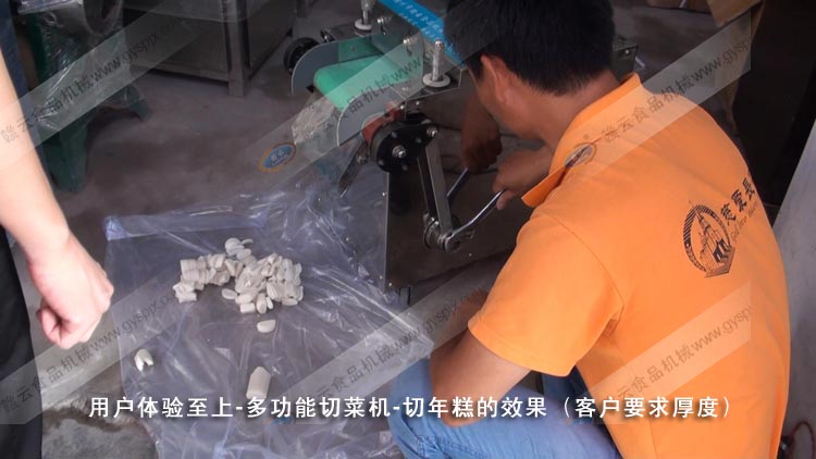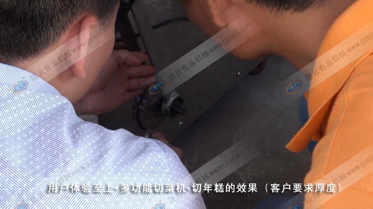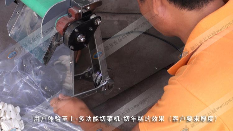 2012年6月27日上午,贛云接待了來自浙江溫州市王先生,體驗多功能切菜機(GY-QC-660)切年糕片的效果,試機過程,贛云技術(shù)人員演示了切菜機的走刀量的調(diào)整,王先生也親自掌握了走刀量調(diào)整操作技術(shù)要點,以下是試機過程實拍圖片: