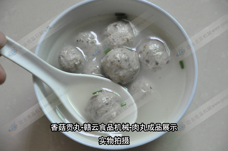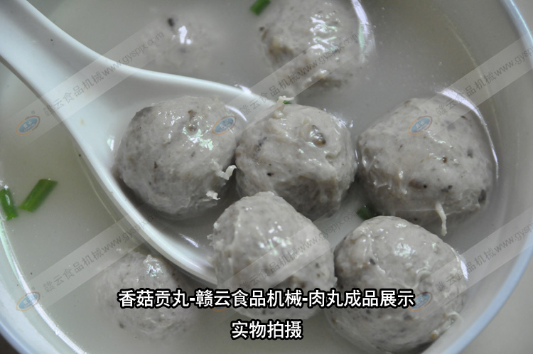 贛云食品機(jī)械肉丸成套設(shè)備的結(jié)晶,香菇貢丸,合作客戶獨(dú)家配方,用贛云牌肉丸設(shè)備制作的香菇貢丸,味美,有嚼勁,香菇原味,保證您吃了還想吃。香菇貢丸所需設(shè)備:自動(dòng)絞肉機(jī)一臺(tái),高速打漿機(jī)一臺(tái),慢速打漿機(jī)一臺(tái),食物切碎機(jī)一臺(tái),貢丸機(jī)一臺(tái),自動(dòng)煮丸水槽一臺(tái)即可現(xiàn)做現(xiàn)賣,也可接單定做。相關(guān)設(shè)備的工作內(nèi)容:自動(dòng)絞肉機(jī)碎肉,高速打漿機(jī)將肉粒快速打成肉漿,慢速打漿機(jī)將肉漿調(diào)味,食物切碎機(jī)將香菇切成細(xì)小顆粒,放入慢速漿機(jī)中和肉漿一起調(diào)勻入味,貢丸機(jī)將肉漿成型貢丸,自動(dòng)煮丸水槽將成型后的肉丸初步定型。批量的香菇貢丸就是這樣制作而成。