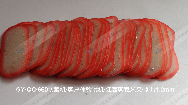 贛云牌多功能切菜GY-QC-660型切江西客家米果片,來自江西龍南縣客戶要求厚度在1.2-1.5mm之間,該設(shè)備可切范圍0-20mm,試機成功。