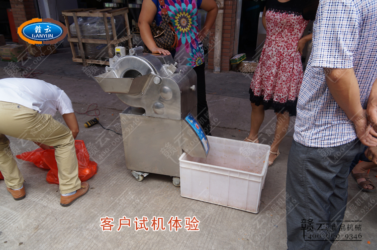 贛云牌130型果蔬切丁機(jī)迎來客戶新體驗,贛南地區(qū)某商戶加工土豆、胡蘿卜、香芋等,尋求能切15mm丁,5mm絲的機(jī)械設(shè)備,贛云工作人員為其推薦了130型果蔬專用切丁機(jī),切丁刀組完全安裝,切出來就是丁,跟換切絲刀組就能切不同規(guī)格的絲了,試機(jī)效果良好,符合客戶加工需求。