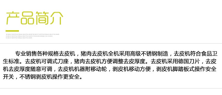 扒皮機(jī)全機(jī)采用高級(jí)不銹鋼,符合國(guó)家食品衛(wèi)生標(biāo)準(zhǔn)?烧{(diào)式刀座,方便調(diào)整去皮厚度。采用優(yōu)質(zhì)刀片,馬力十足,清洗方便,無(wú)需拆卸簡(jiǎn)單操作,輕松清洗,操作桿靈活自由變動(dòng),機(jī)器附移動(dòng)輪,撥皮更方便,腳踏板式操作安全開(kāi)關(guān)。不銹鋼撥皮機(jī)操作更安全,機(jī)器小巧靈便。
