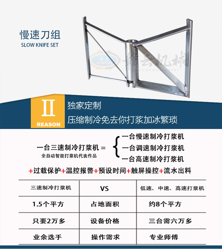 擁有一臺三速制冷打漿機,你就等于擁有:一臺慢速制冷打漿機、一臺高速制冷打漿機外加一臺變頻調速制冷打漿機,從投資的角度你就省了好幾萬。一臺三速制冷打漿機占地面積不到1.5個平方,而三臺機器占地面積至少需要8個平方,面積又省了,再看三速制冷打漿機,無需擔憂肉質問題,敏感的溫度感應自動報警停機系統(tǒng),配合流水式出漿,省時省力,可安全放心生產,不僅是中小肉丸廠商需要的打漿設備,同時也是大型肉丸廠實驗用制漿設備。贛云三速制冷打漿機,程序智能控制,傾力打造智能打漿設備高質量品牌。贛云三速制冷打漿機,多功能打漿設備的代表產品,引領未來打漿設備新格局,你值得擁有!