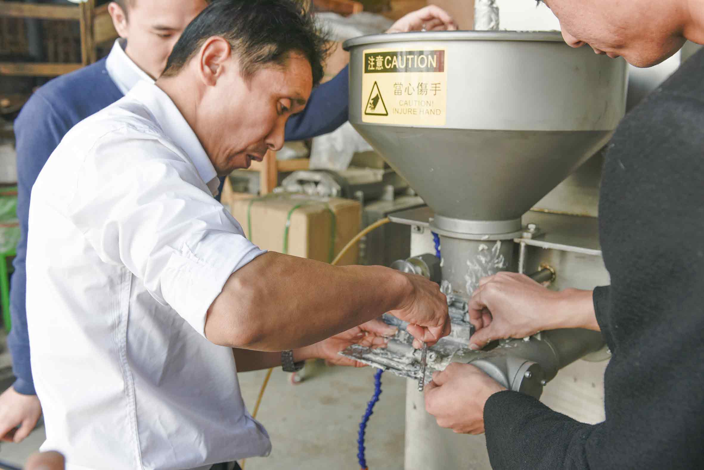 客戶看到丸子調(diào)整的過程,便來了興致要向技術(shù)人員學(xué)習(xí)如何調(diào)機(jī)器,客戶現(xiàn)場調(diào)整肉丸成型刀片。