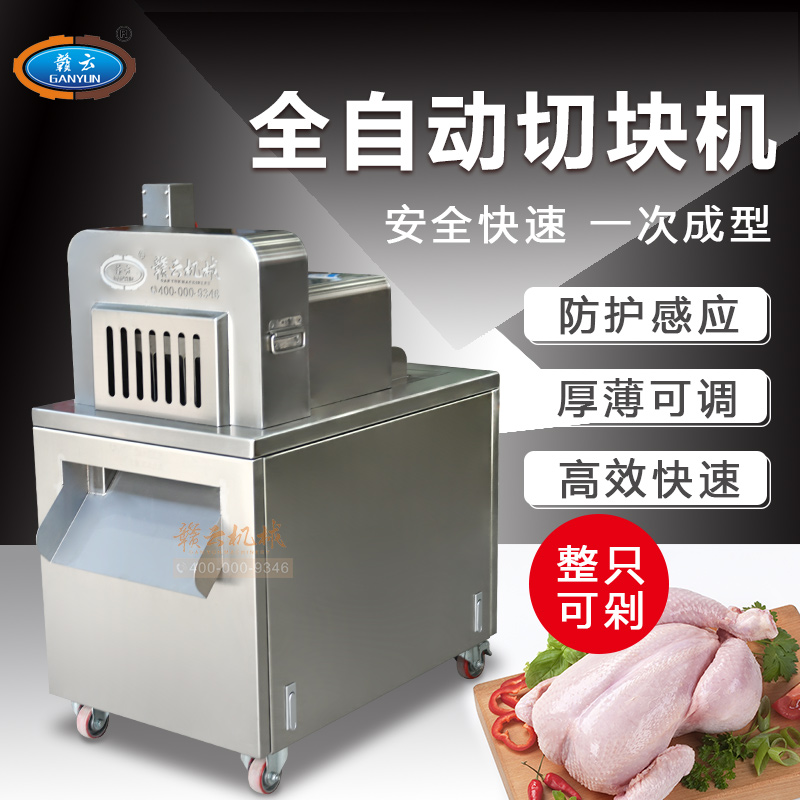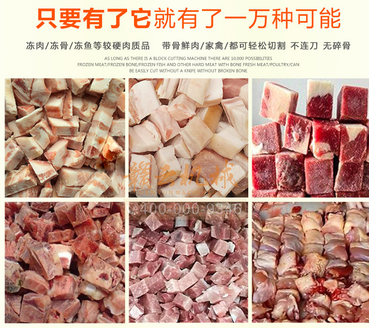 贛云全自動切塊機是切斷各種動物骨頭及帶肉骨頭的機器,可切凍肉,凍骨,凍魚等較硬食品,還可以完全切斷新鮮的帶肉骨頭、鮮肉、家禽,完全切段、不連刀、無碎骨。