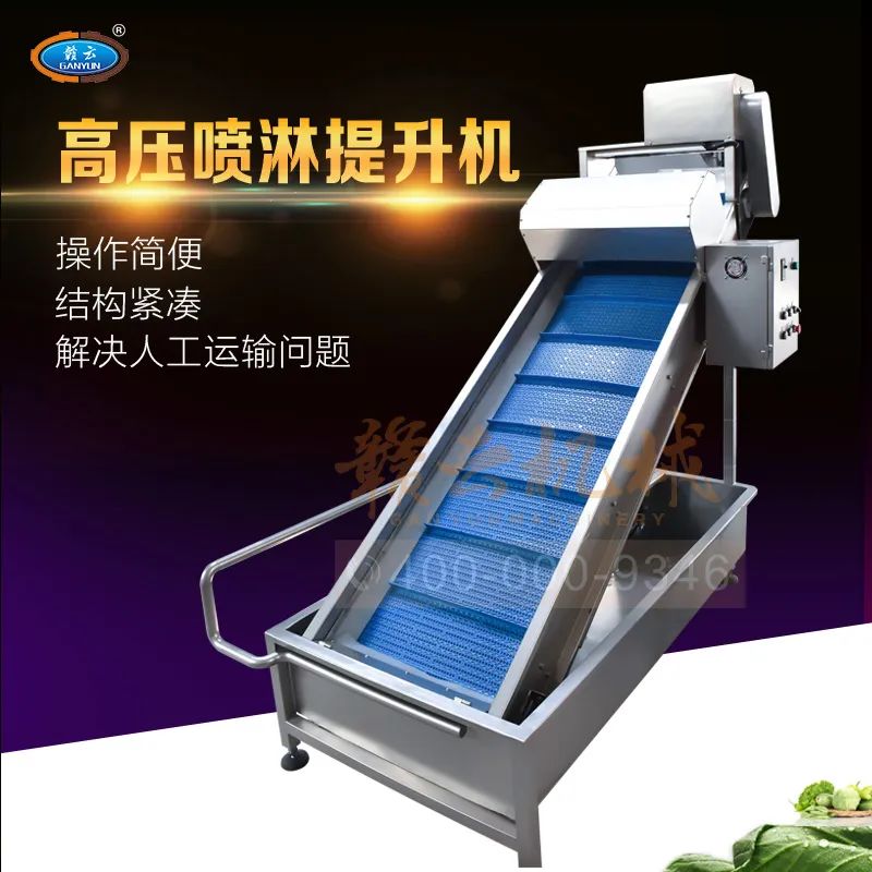 本機(jī)主要用于蔬果提升和清洗前的預(yù)洗,提升處安裝有噴淋裝置,可以減少進(jìn)入洗菜機(jī)的清洗時間,下面安裝有接水盤和自動去雜裝置,是蔬果加工配套設(shè)備的主要輔助機(jī)械。