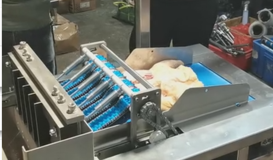 應(yīng)客戶需求(將-3攝氏度左右的整雞切成塊),今天客戶交了試機材料費后我們就去市場買好了凍雞進行試機效果拍攝。