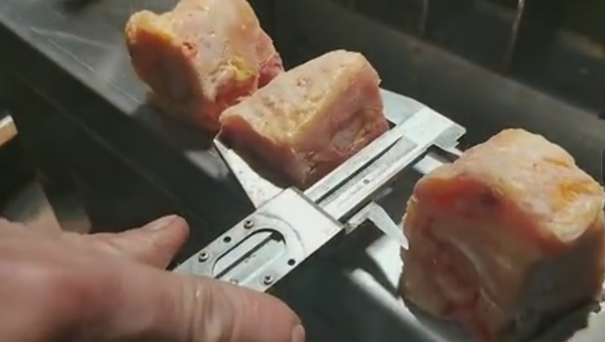 把雞肉放到傳送帶上,通過刀的時候可以看出切割雞肉非常迅速穩(wěn)定,大小也均勻。
