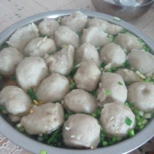 將打漿好的豬肉帶回家然后煮水,溫度差不多60的時(shí)候即可以開始用手?jǐn)D出肉丸形狀用勺子挖入水中成型。