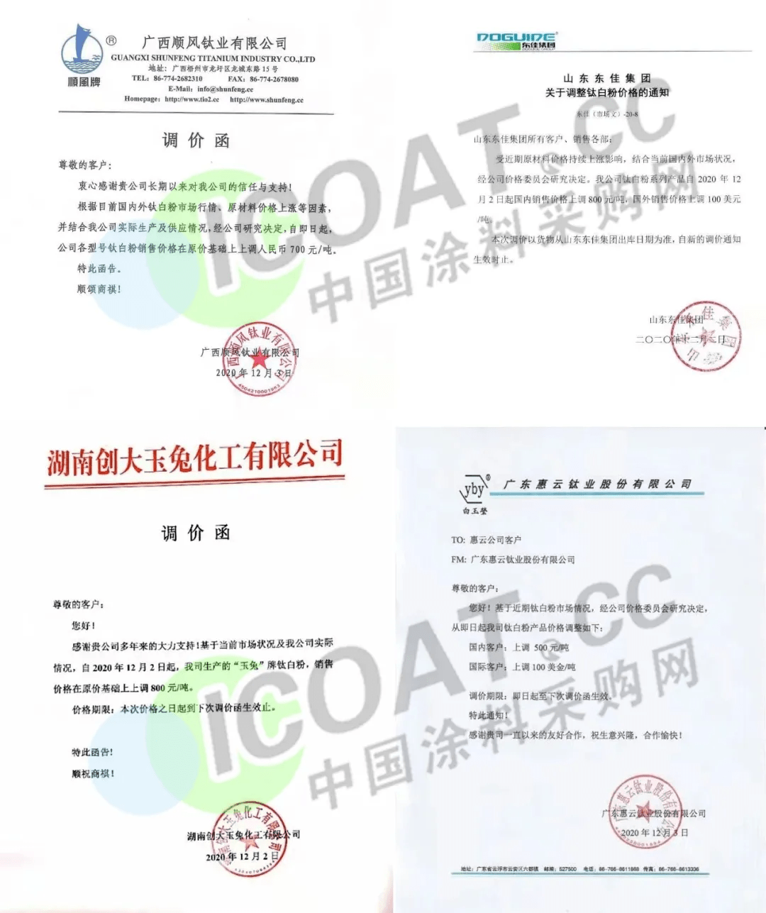 2020年12月1日起,鈦白市場(chǎng)再次掀起新一波漲價(jià)潮。據(jù)不完全統(tǒng)計(jì),目前已有近20家主流鈦白廠商發(fā)布漲價(jià)通知,其中包括龍蟒佰利聯(lián)、攀鋼、海峰鑫、山東道恩、廣西順風(fēng)等。此次調(diào)價(jià)鈦白企業(yè)調(diào)價(jià)幅度多為700-1000元,且已經(jīng)開(kāi)啟了全年第8輪調(diào)價(jià),累計(jì)調(diào)漲最高5300元/噸。