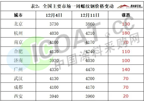 受黑色系期貨連續(xù)拉漲,以及原料價(jià)格整體走強(qiáng)等因素提振,國(guó)內(nèi)建筑鋼材迎來(lái)一波強(qiáng)勁反彈。12月11日,北京地區(qū)調(diào)漲130元/噸,杭州調(diào)漲180元/噸,南京調(diào)漲70元/噸,合肥調(diào)漲110元/噸,濟(jì)南調(diào)漲100元/噸,廣州調(diào)漲140元/噸,武漢、成都、西安調(diào)漲70元/噸。