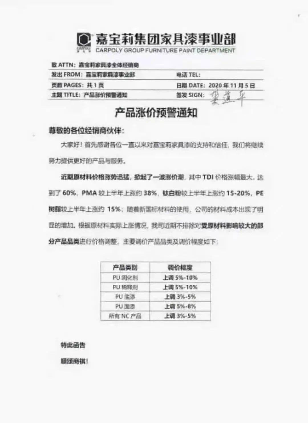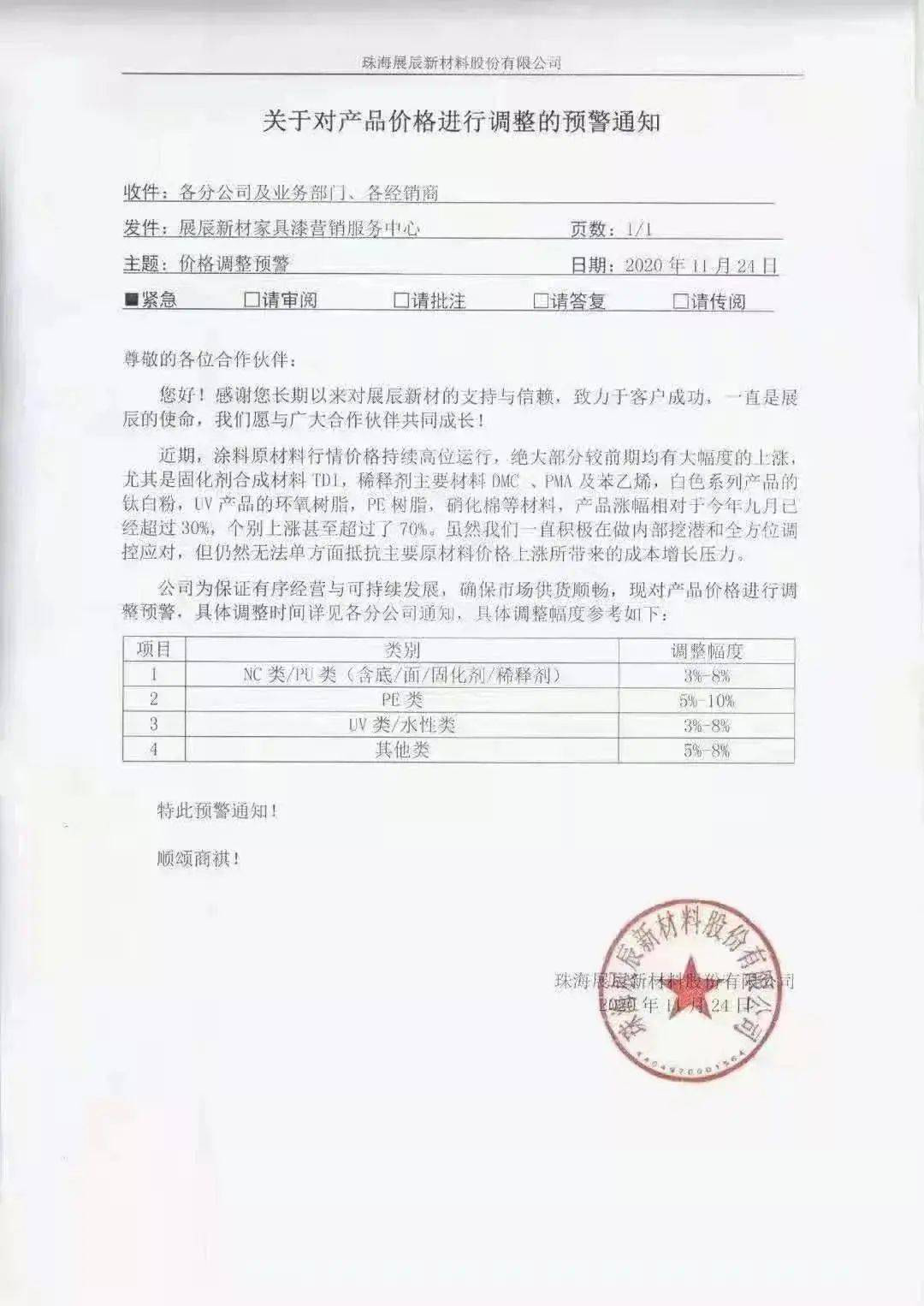 早在今年11月3日,以重防腐涂料為主營(yíng)業(yè)務(wù)的無(wú)錫福斯特涂料有限公司則對(duì)外發(fā)布調(diào)價(jià)通知函,宣布:于2020年11月3日起在現(xiàn)售價(jià)基礎(chǔ)上:溶劑型涂料上調(diào)10%,水性涂料上調(diào)5%,其余系列產(chǎn)品全部上調(diào)5%。