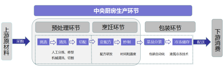 預制菜工藝流程:粗加工、細加工、加熱烹調(diào)、包裝、冷卻、配送等六個環(huán)節(jié)。