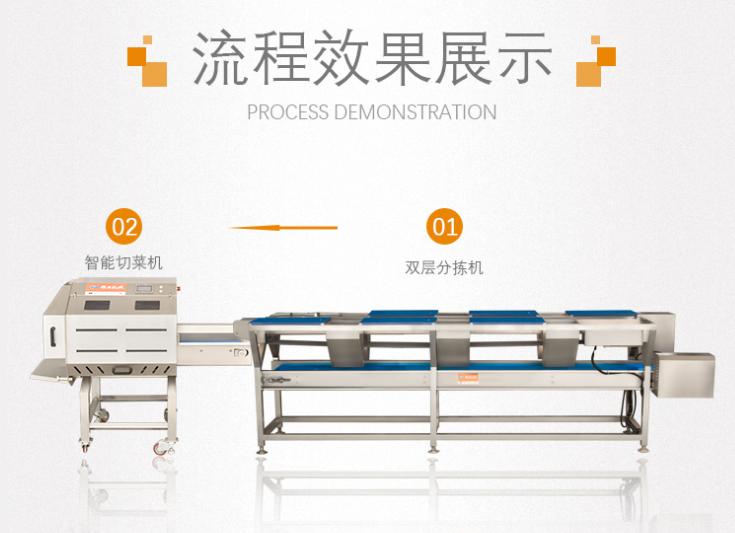 蔬菜經(jīng)人工挑選預(yù)處理后放入相應(yīng)分選輸送帶,輸送至多元化數(shù)字切菜機(jī)中進(jìn)行切割,并由提升機(jī)提升至渦流振蕩清洗機(jī)內(nèi)進(jìn)行清洗,利用臭氧發(fā)生器保證物料的鮮度,后經(jīng)高頻振蕩機(jī)沖洗過濾,為避免氧化變質(zhì),可真空包裝并冷鮮保存。
